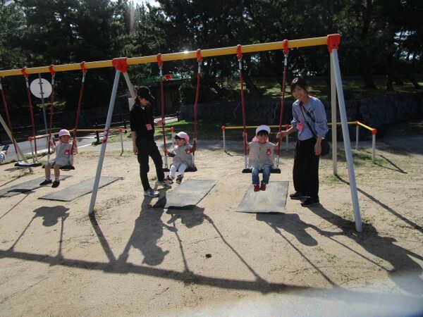 公園では、いろんな種類の滑り台をしたりカゴのブランコを楽しんだり!お昼は、レジャーシートを広げてみんなでお弁当タイム♬