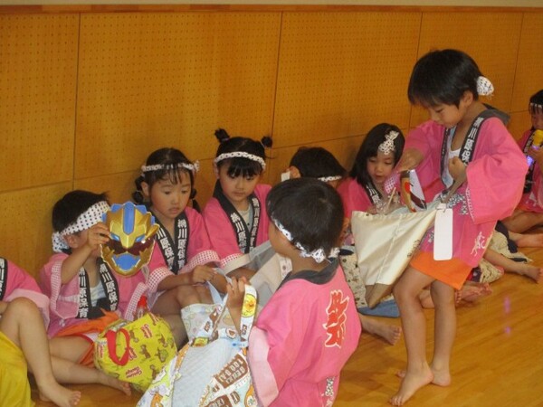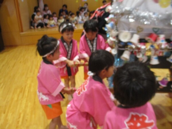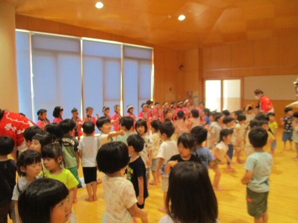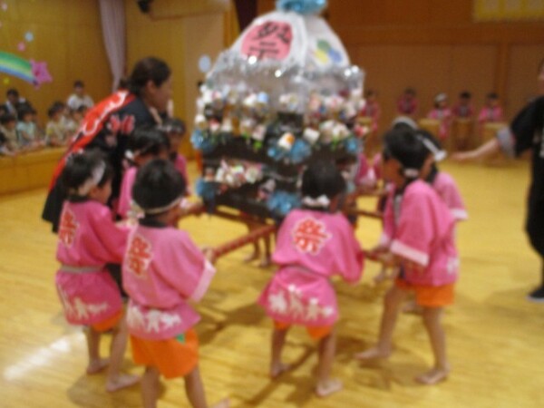 すみれ組がお手本となりみんなで『総踊り体操』を踊ったり!ばら組・ゆり組・すみれ組が共同作業で作ったお神輿を担ぎ祭り気分を楽しみました!
