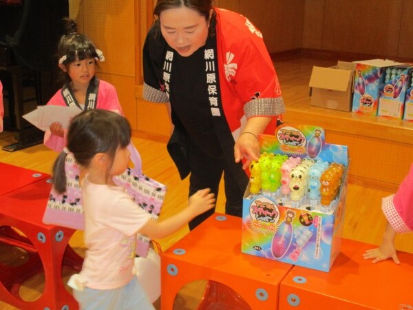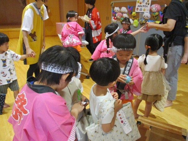 本日は、すみれ組のお店屋さんが開かれ、シャボン玉やガチャガチャ・お面・チョコバナナなど色々なコーナーを巡り楽しみました。
