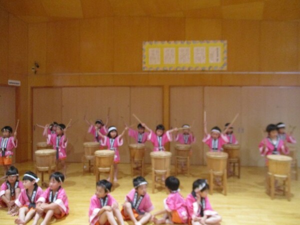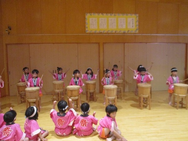 オープニングは樽太鼓演奏。ばら組(3歳児)は『三・三・七拍子』を、ゆり組(4歳児)は『新潟甚句』を演奏してお祝いしました。すみれ組(5歳児)も『網川原太鼓』を演奏してくれました。