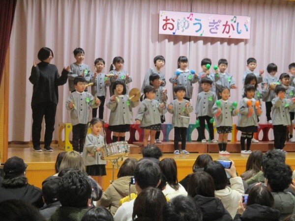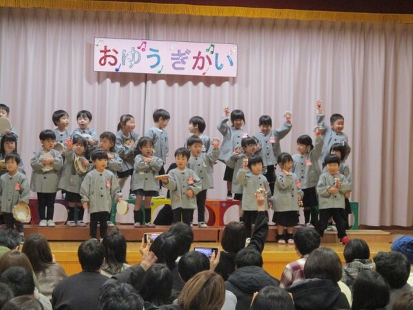 ゆり組の歌は「パンどろぼうの絵かきうた」楽器あそびでは「おもちゃのチャチャチャ」の曲に合わせいろんな楽器を使って演奏してくれました。
