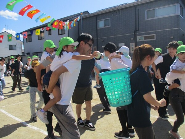 親子競技は、お家の方が子どもをおんぶをし騎馬戦にチャレンジ!帽子を取りに手を伸ばしたり、相手に取られないよう守ったりして頑張っていました。