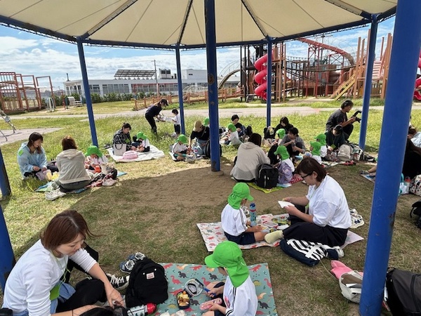 公園では、いろんな種類の滑り台をしたりカゴのブランコを楽しんだり!お昼は、レジャーシートを広げてみんなでお弁当タイム♬